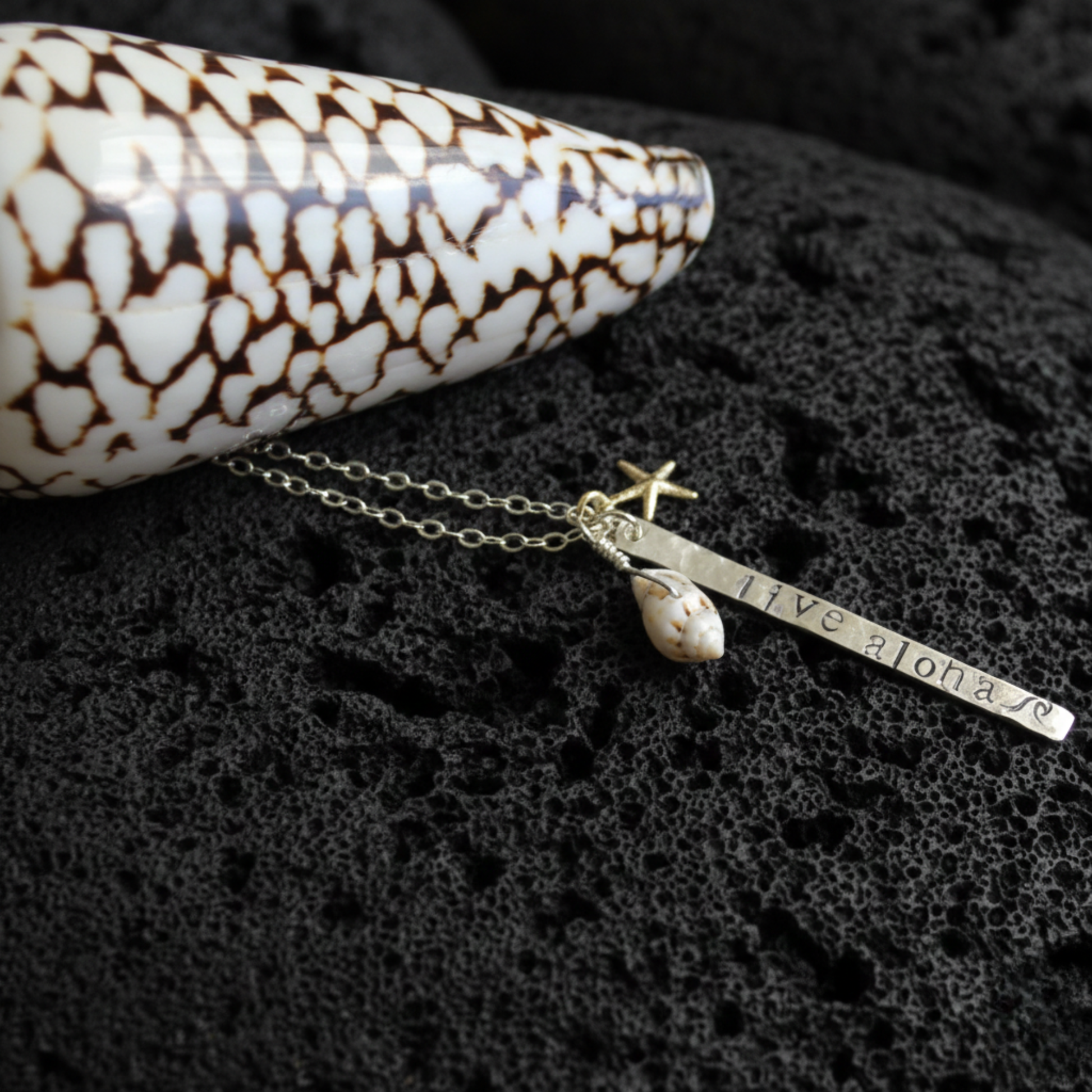A reminder to "Live Aloha", this hand stamped vertical pendant necklace comes in either gold filled or sterling silver. It's accented with a tiny starfish and nassa shell.