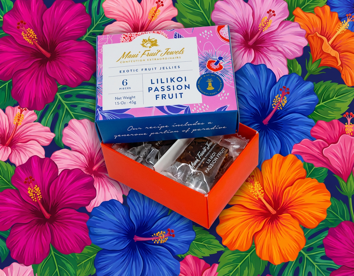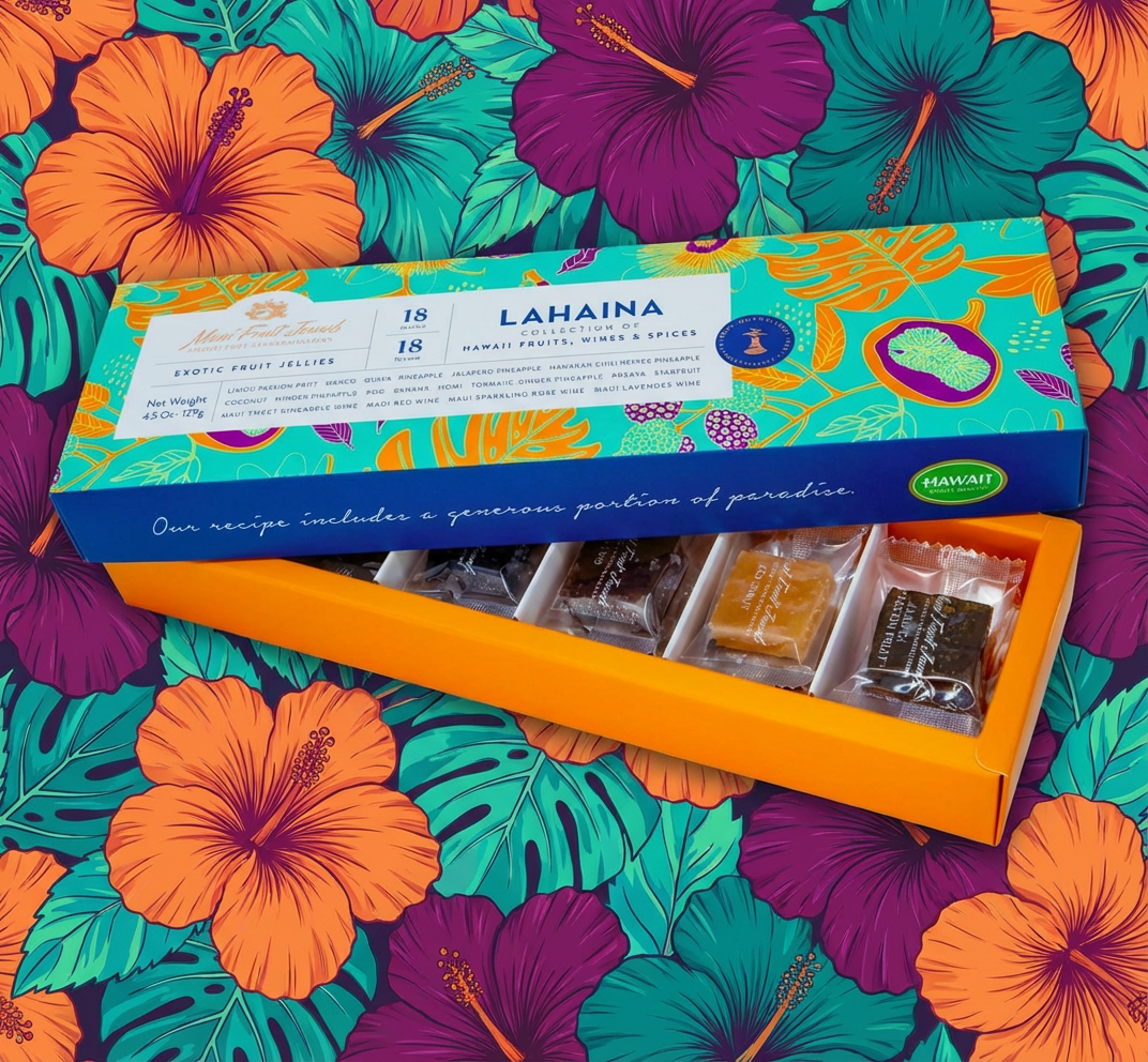 Exotic Fruit Jellies is the original product line created by Maui Fruit Jewels, and it is like divine fruit gummies for adults, made from Hawaii-grown fruits. It is inspired by the traditional French confection “pates de fruits”, and received the prestigious silver sofi™ Awards from the Specialty Food Association in 2014. Exotic Fruit Jellies are to be enjoyed in the same way chocolate bonbons are savored. Presented in premium gift boxes, it is a great way to share fruits of the islands.